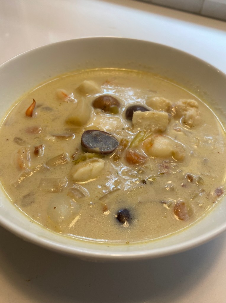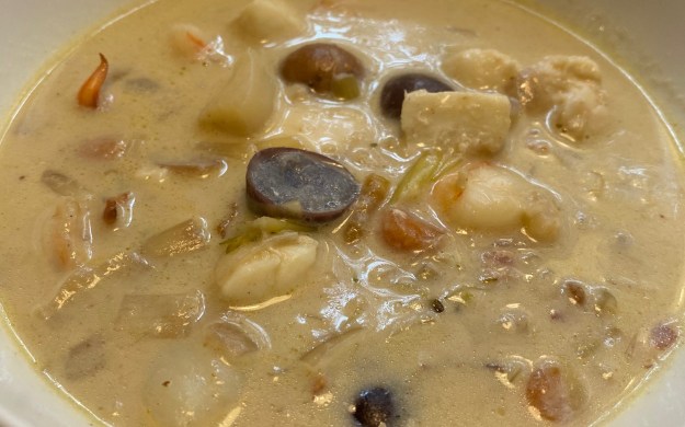 For this you’ll need: 3-4 cups crab or fish stock, 3 leeks (roughly chopped), 2 shallots (chopped), 5 strips bacon (cut into small cubes), 2 carrots (peeled and cut into 1/4″ pieces), 3-6 small potatoes (peeled and cut into 1/4″ pieces), 1 cup white wine, 5-6 fresh thyme sprigs, 3 bay leaves, 1 cup heavy cream, 1/2 lb manila clams, 1/3 lb halibut (skinned and cut into cubes), 1/3 lb raw shrimp (peeled, deveined, cut in half), x4 scallops (cut into quarters), 2 tsp curry powder, 1/2 tsp cumin, 1-2 tsp garam masala, 2 + 3 Tbsp unsalted butter, 3 Tbsp flour, salt, pepper.