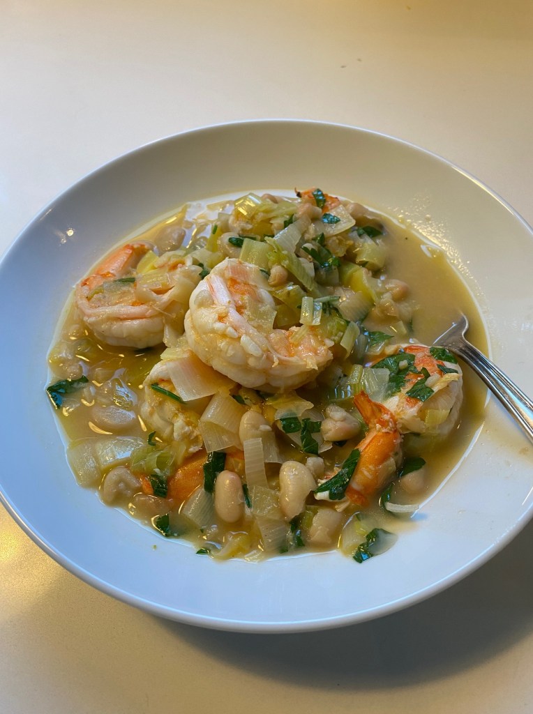 For this you’ll need: 1 lb raw shrimp (deveined and shelled), x2 leeks (chopped), x3 cloves garlic (grated), 2 Tbsp paprika, 2 Tbsp lemon zest, 2-4 Tbsp lemon juice, 2 Tbsp fresh parsley (chopped), 1 15oz can white beans (drained and rinsed), 4 Tbsp unsalted butter, 2 cups chicken stock, salt, pepper.