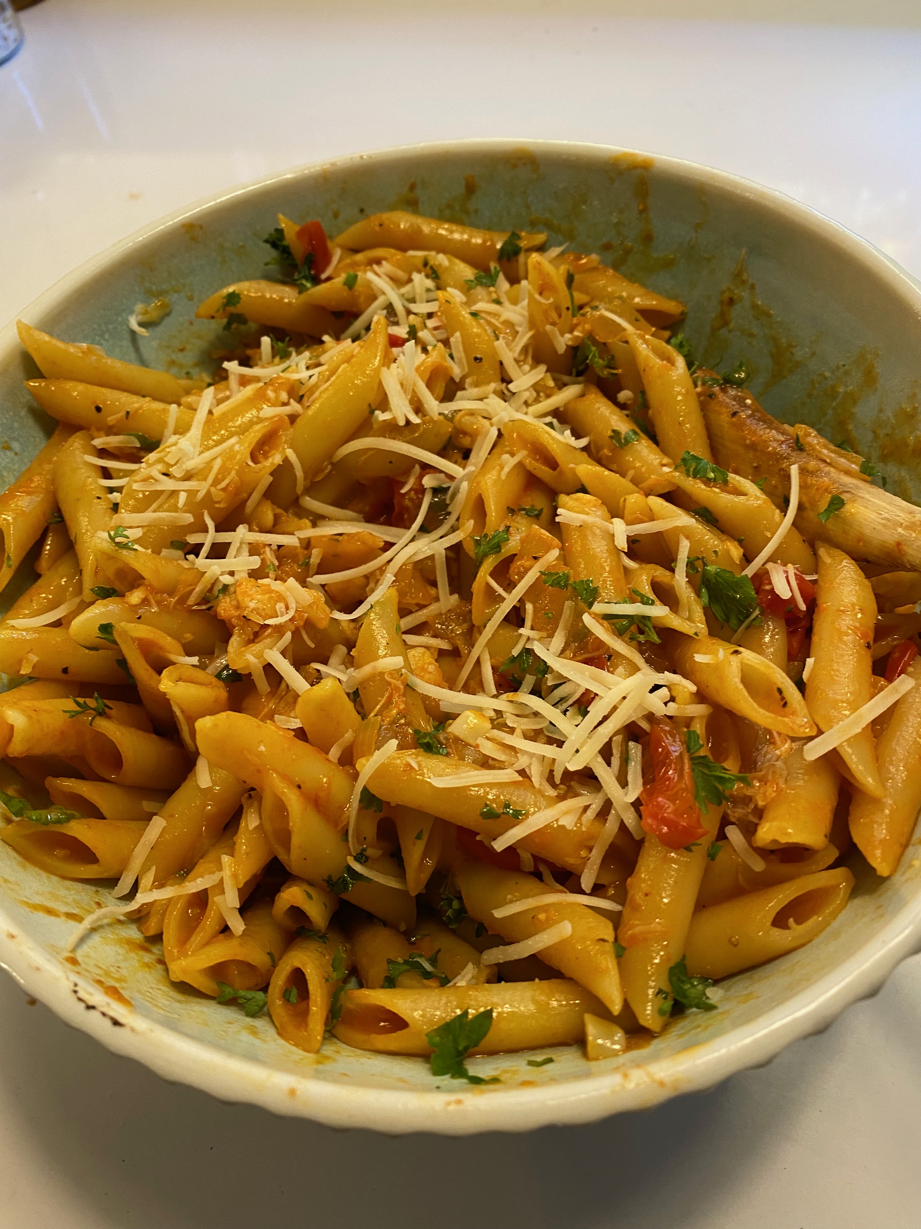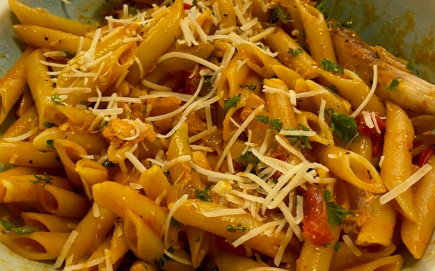 This was a great use of some local crab meat (thank you Oregon Coast) that we had not used in our monthly crab cakes feast. It comes from Julia Turshen in the Washington Post, and should be made with Bucatini, but we used penne because it (also) needed to be used up. This dish can also be spiced up by using an sweet chili sauce, chili powder or hot sauce, as needed. The simple tomato sauce works well as a texture with the lump crab meat.