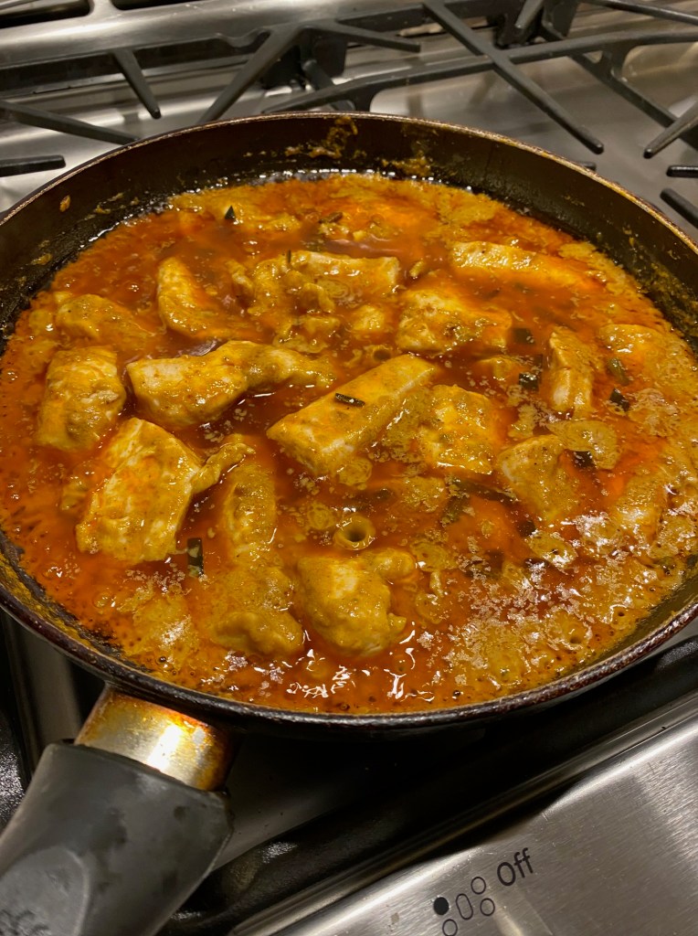 This is a versatile and extremely flavorful dish that you can adjust in many different ways. Add hot peppers or red bell peppers (we used hot), add peas or potatoes, use chicken, shrimp or nothing at all (we used chicken). It comes from Naz Deravian in NYTimes cooking.