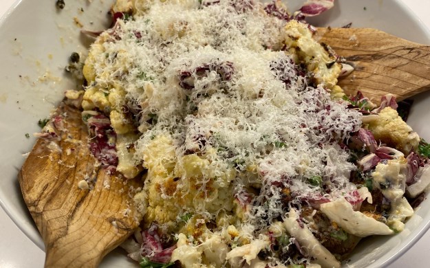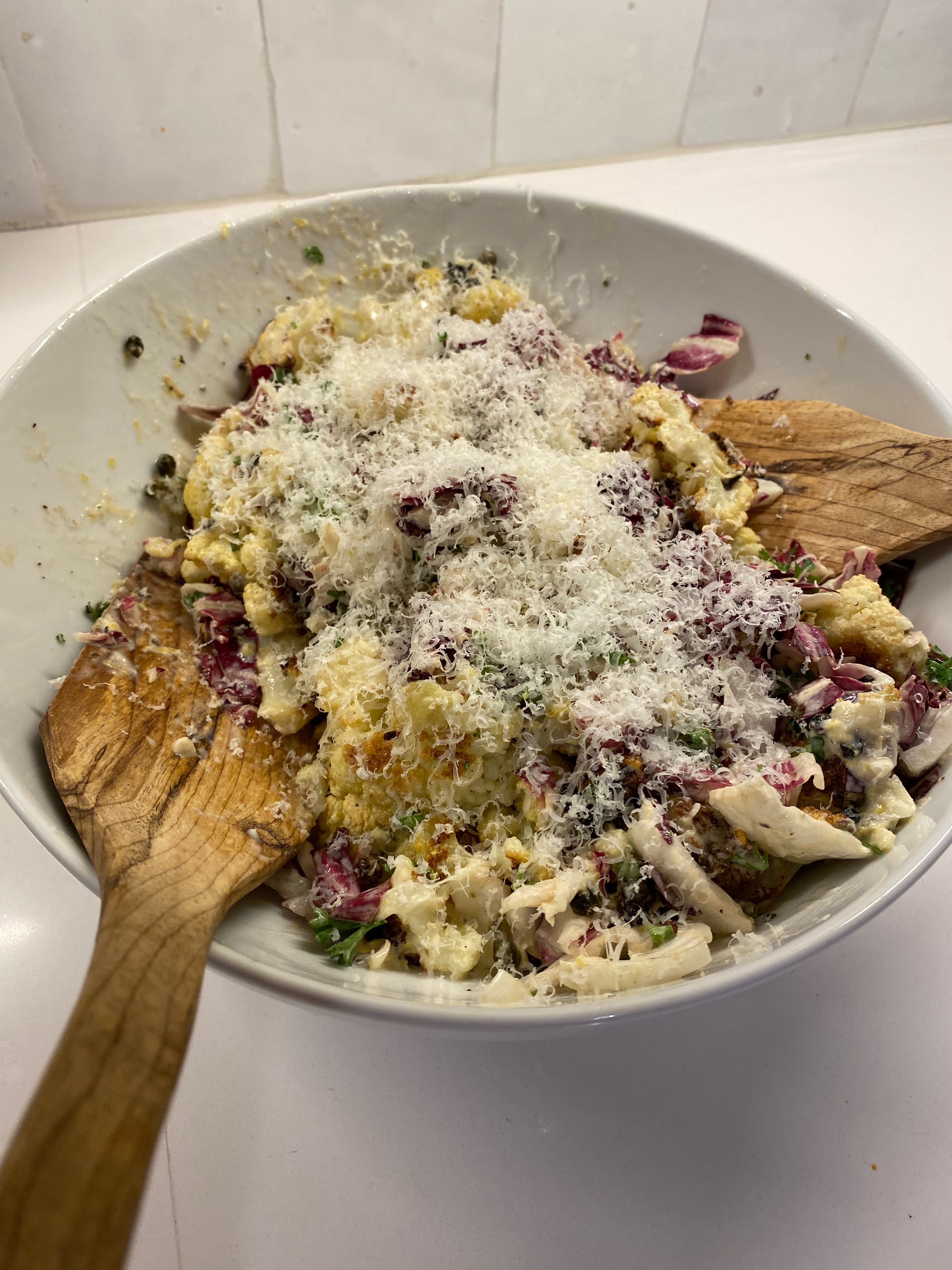 Remove the cauliflower from the oven and let cool for about 10-15 mins. Meanwhile place the chopped radicchio and parsley into a large serving bowl. Add the (now cooled) roasted cauliflower and the dressing and toss well to coat everything. Add some addition grated parmesan onto the top for serving.