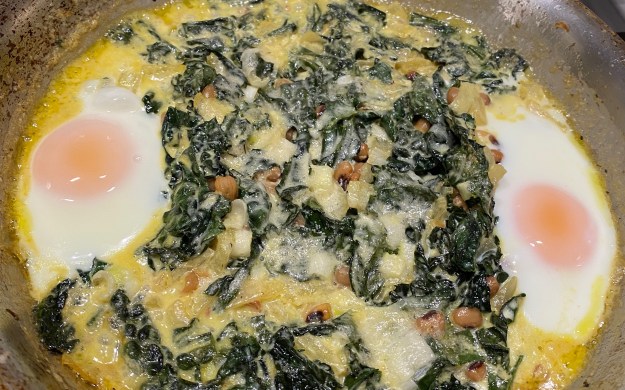 There is some Southern heritage in our family, so black eyed peas on New Year’s Day is a tradition. Most years there are faves like “Cowboy Caviar” or “Hoppin’ John” but this year we went with a distant cousin of Shakshuka and modified our own Baked Eggs with kale recipe and included BEP. The result was very satisfying.